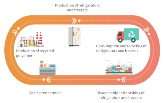 Wanhua Chemical has proposed a complete life cycle solution for rigid PU foam. Through chemically processing waste foam to obtain reproduced foaming raw materials, it achieves the circulation of insulation layers in household appliances, ensuring even product performance while bringing economic and ecological benefits. For PP/PE chemical recycling, Wanhua Chemical employs thermal cracking and catalytic cracking processes and to achieve an enhanced product quality. Additionally, the company has made significant breakthroughs in degrading waste PC into bisphenol A, for exploring a new sustainable raw material source.