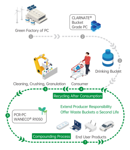 Wanhua Chemical employs innovative mechanical recycling methods to process discarded automotive lights and drinking bucket made from PC, for transforming them into Waneco®rPC. It reduces carbon emissions by 20%-50% compared to origin PC and extends the material life cycle, with meeting diverse industry demands. On the other hand, the recycled TPU product, Wanthane®G7530, incorporated with 30% recycled materials, effectively lowering the carbon footprint of end products by 20%. With the traceable value chain solutions, it brings circular economy concept to specific consumption goods.