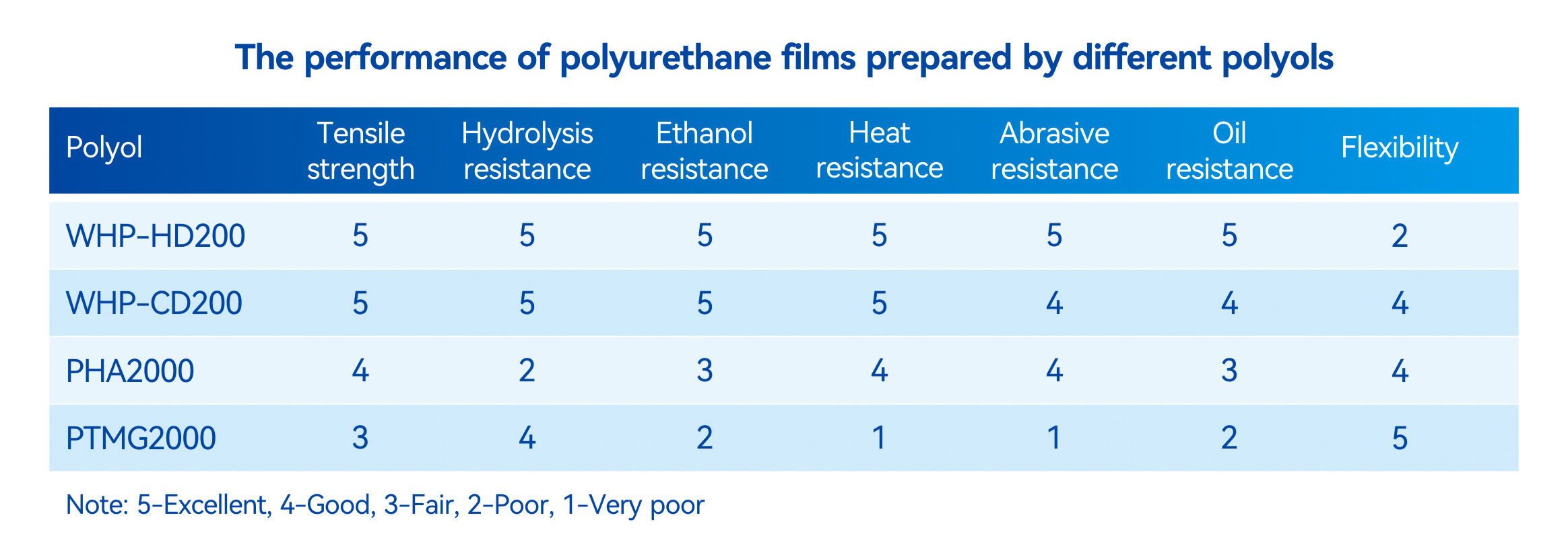 The WHP-CD series is liquid at room temperature, making it easy to use or process. The final PU products show good compatibility with conventional solvents. Besides, the flexibility and low-temp resistance seem superior.