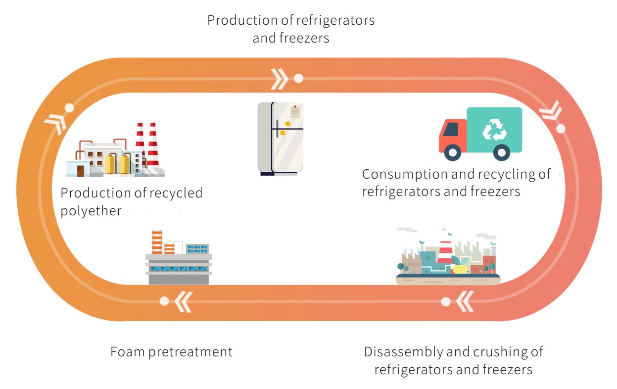 Wanhua Chemical has pioneered a cutting-edge technology to recycle polyurethane rigid foam waste from discarded refrigerators and freezers. The process efficiently recovers and purifies the foam, achieving 100% degradation and regeneration, with the recycled polyether polyol offering performance equivalent to petroleum-based alternatives. This innovation not only delivers high-quality recycled materials but also supports the industry’s shift towards more sustainable practices. Each ton of recycled foam prevents the emission of 3 tons of CO2, significantly reducing the environmental impact.
